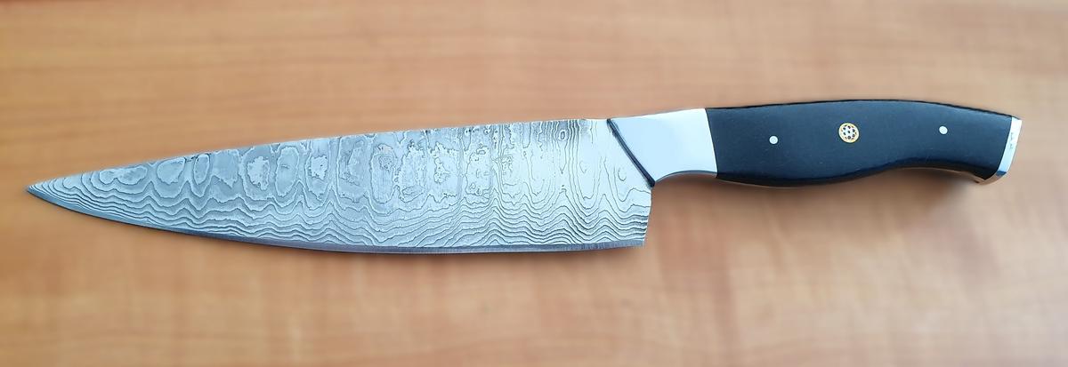 Damast-Kochmesser, Micarta-Griff schwarz, Klinge Damaszener Stahl, rund 150 Lagen, charakteristische, rustikale Schmiedeoberfläche, Gesamtlänge 310 mm, Klingenlänge 185 mm, Klingenstärke 3mm?d=2025-12-06 05:33:00