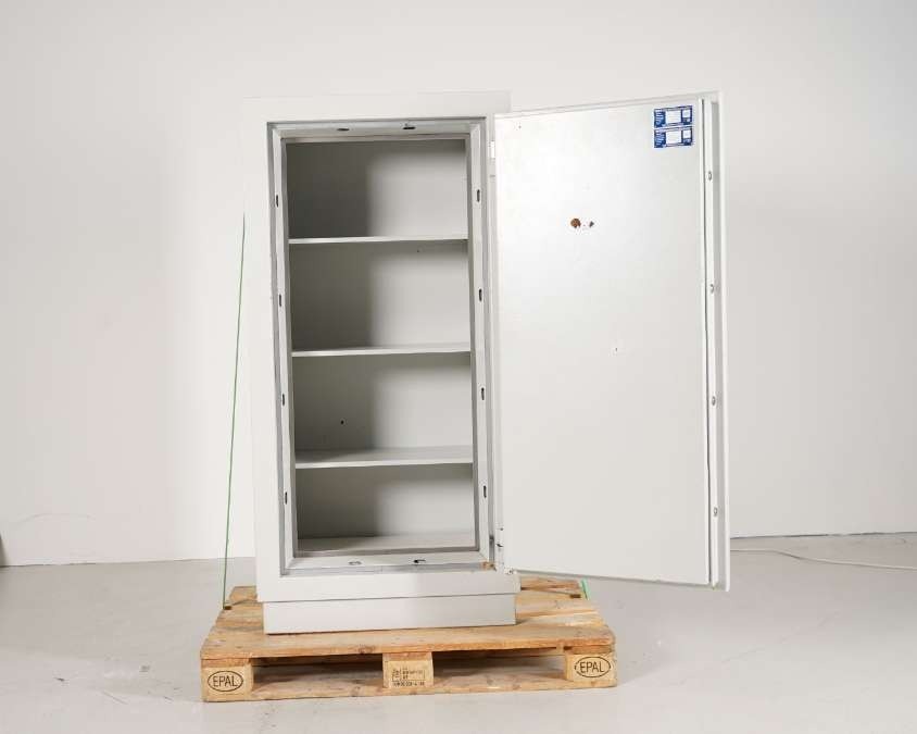 Tresor mit Zahlenschloss, Maße: 79,5 x 56 x 160 cm, Platte, Korpus und Türen: Hellgrau, Sockel: Hellgrau