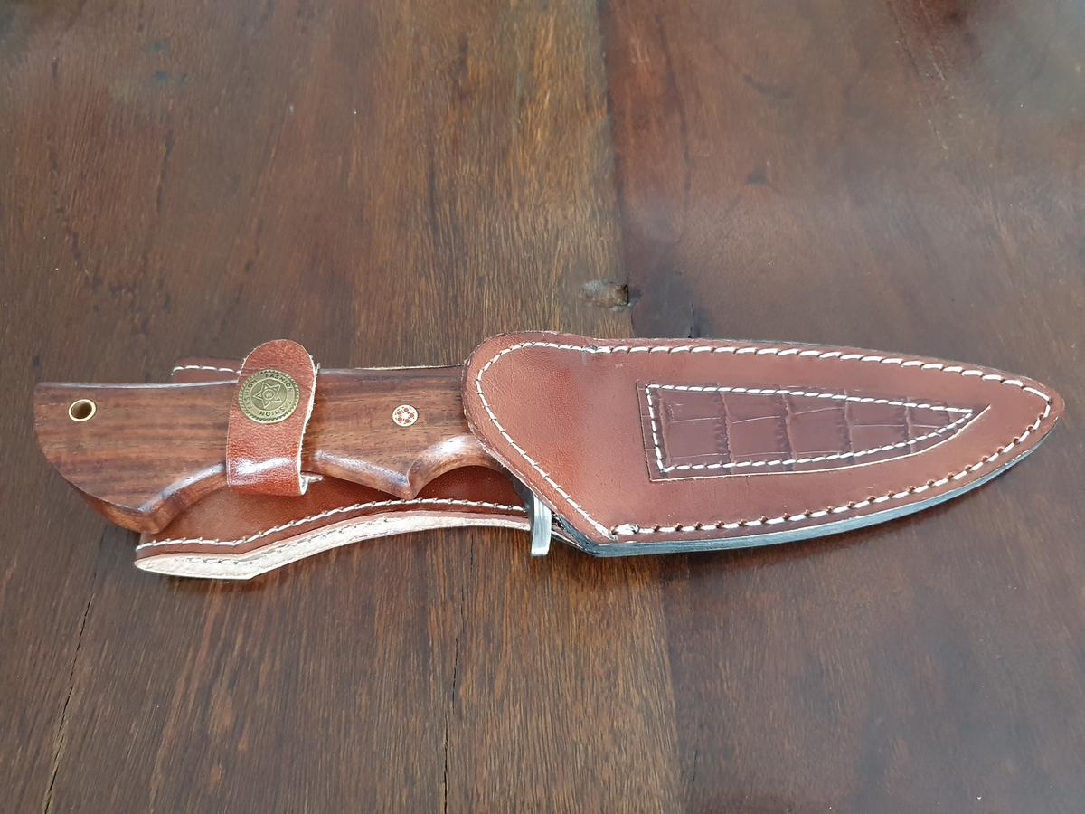 Damast Jagdmesser, Karbonstahl, rund 150 Lagen, charakteristische, rustikale Schmiedeoberfläche, Griff aus Holz, Gesamtlänge 260 mm, Klingenlänge 120 mm, Klingenstärke 4mm, Leder Messerscheide 165 mm Länge?d=2026-03-07 06:04:58