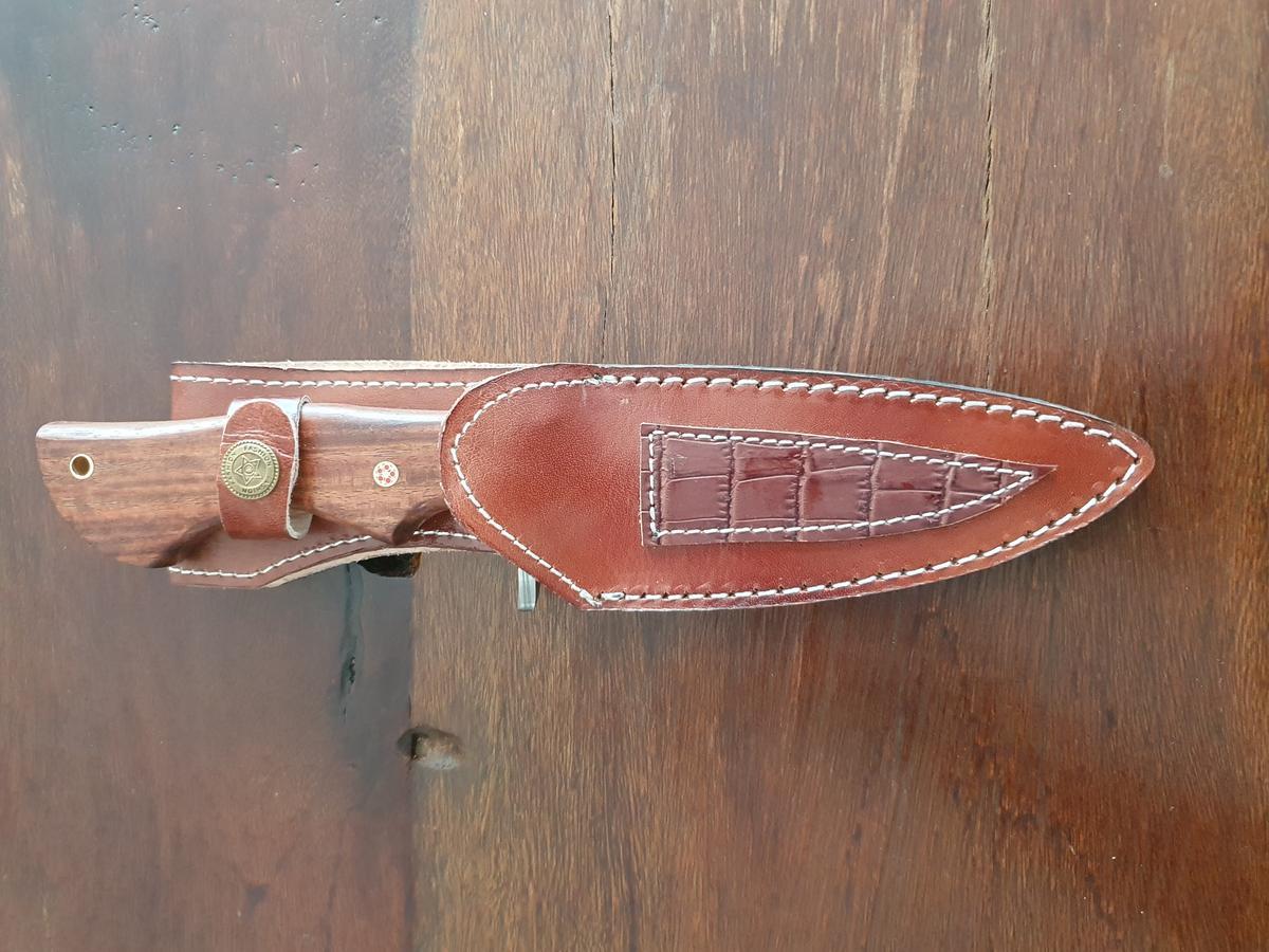 Damast Jagdmesser, Karbonstahl, rund 150 Lagen, charakteristische, rustikale Schmiedeoberfläche, Griff aus Holz, Gesamtlänge 260 mm, Klingenlänge 120 mm, Klingenstärke 4mm, Leder Messerscheide 165 mm Länge?d=2026-03-07 06:05:02