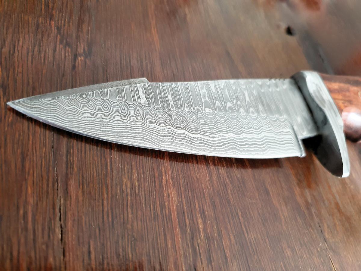 Damast Jagdmesser, Karbonstahl, rund 150 Lagen, charakteristische, rustikale Schmiedeoberfläche, Griff aus Holz, Gesamtlänge 260 mm, Klingenlänge 120 mm, Klingenstärke 4mm, Leder Messerscheide 165 mm Länge
