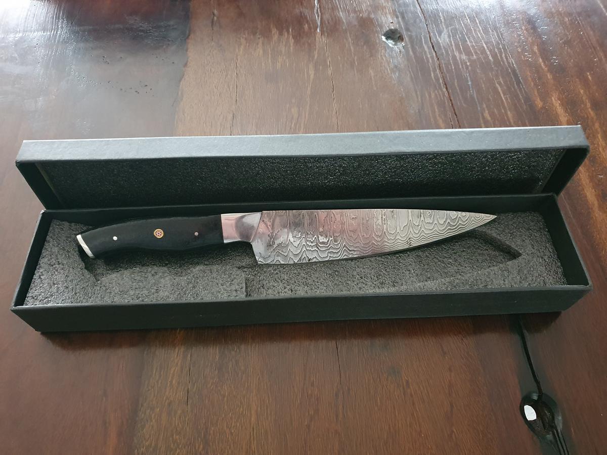 Damast-Kochmesser, Micarta-Griff schwarz, Klinge Damaszener Stahl, rund 150 Lagen, charakteristische, rustikale Schmiedeoberfläche, Gesamtlänge 310 mm, Klingenlänge 185 mm, Klingenstärke 3mm