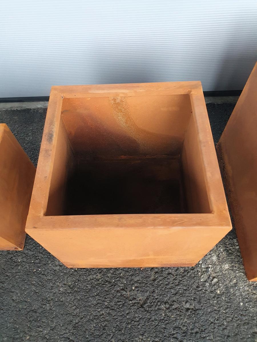Beschreibung: Cortenstahl (Edelrost-Optik), Materialstärke: 2 mm, Einsatzbereich: Outdoor – Garten, Terrasse, Balkon, Gewerbeflächen, Nicht wasserdicht: Ablaufmöglichkeiten für Regenwasser, Witterungsbeständig & langlebig, die Gefäße können je nach Produktionszustand noch nicht vollständig durchgerostet sein – die finale Patina bildet sich im Außenbereich selbstständig, in der Anfangsphase kann Rostwasser abfärben - bitte empfindliche Untergründe entsprechend schützen