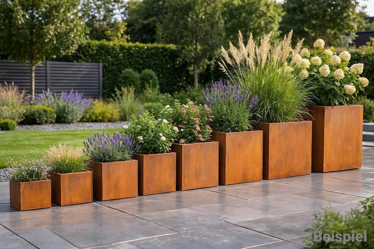 Beschreibung: Cortenstahl (Edelrost-Optik), Materialstärke: 2 mm, Einsatzbereich: Outdoor – Garten, Terrasse, Balkon, Gewerbeflächen, Nicht wasserdicht: Ablaufmöglichkeiten für Regenwasser, Witterungsbeständig & langlebig, die Gefäße können je nach Produktionszustand noch nicht vollständig durchgerostet sein – die finale Patina bildet sich im Außenbereich selbstständig, in der Anfangsphase kann Rostwasser abfärben - bitte empfindliche Untergründe entsprechend schützen